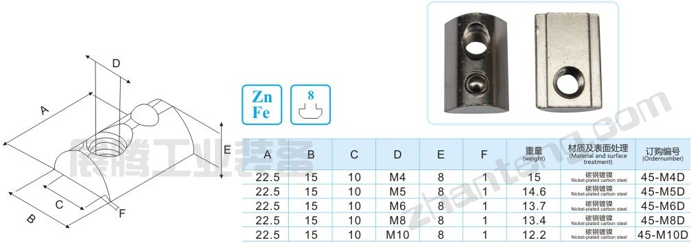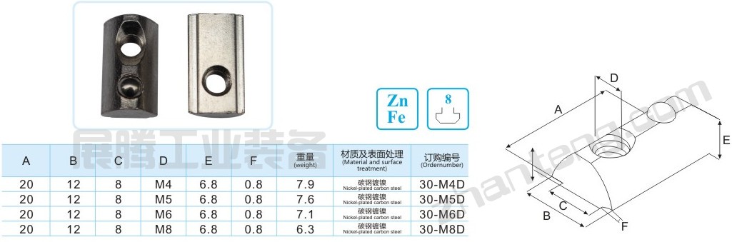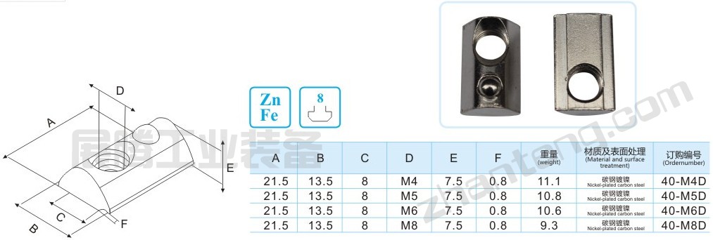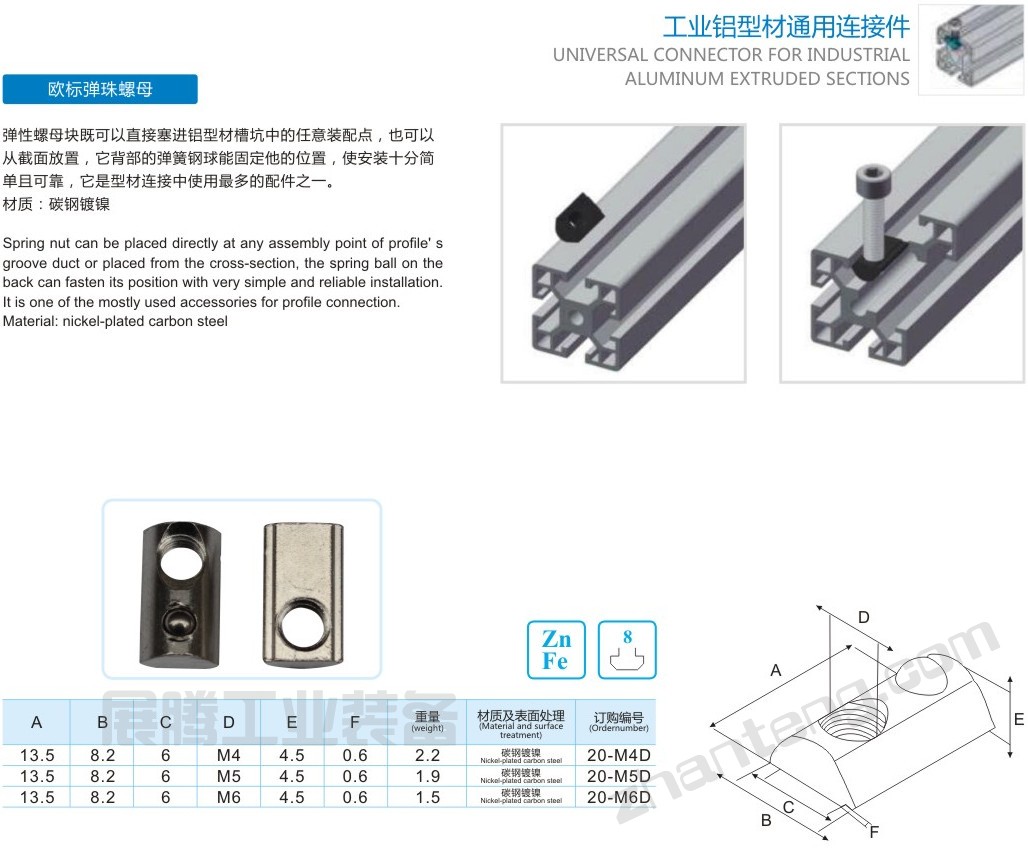 彈珠螺母塊能被直接塞進(jìn)鋁型材槽坑中的任意裝配點(diǎn),它背部的彈簧鋼球能固定它的位置,使安裝十分簡(jiǎn)單且可靠,它是型材連接中使用最多的配件之一。 20x20型工業(yè)鋁型材專用彈珠(彈性)螺母 30x30型工業(yè)鋁型材專用彈珠(彈性)螺母 40x40型工業(yè)鋁型材專用彈珠(彈性)螺母 45x45/50x50型工業(yè)鋁型材專用彈珠(彈性)螺母